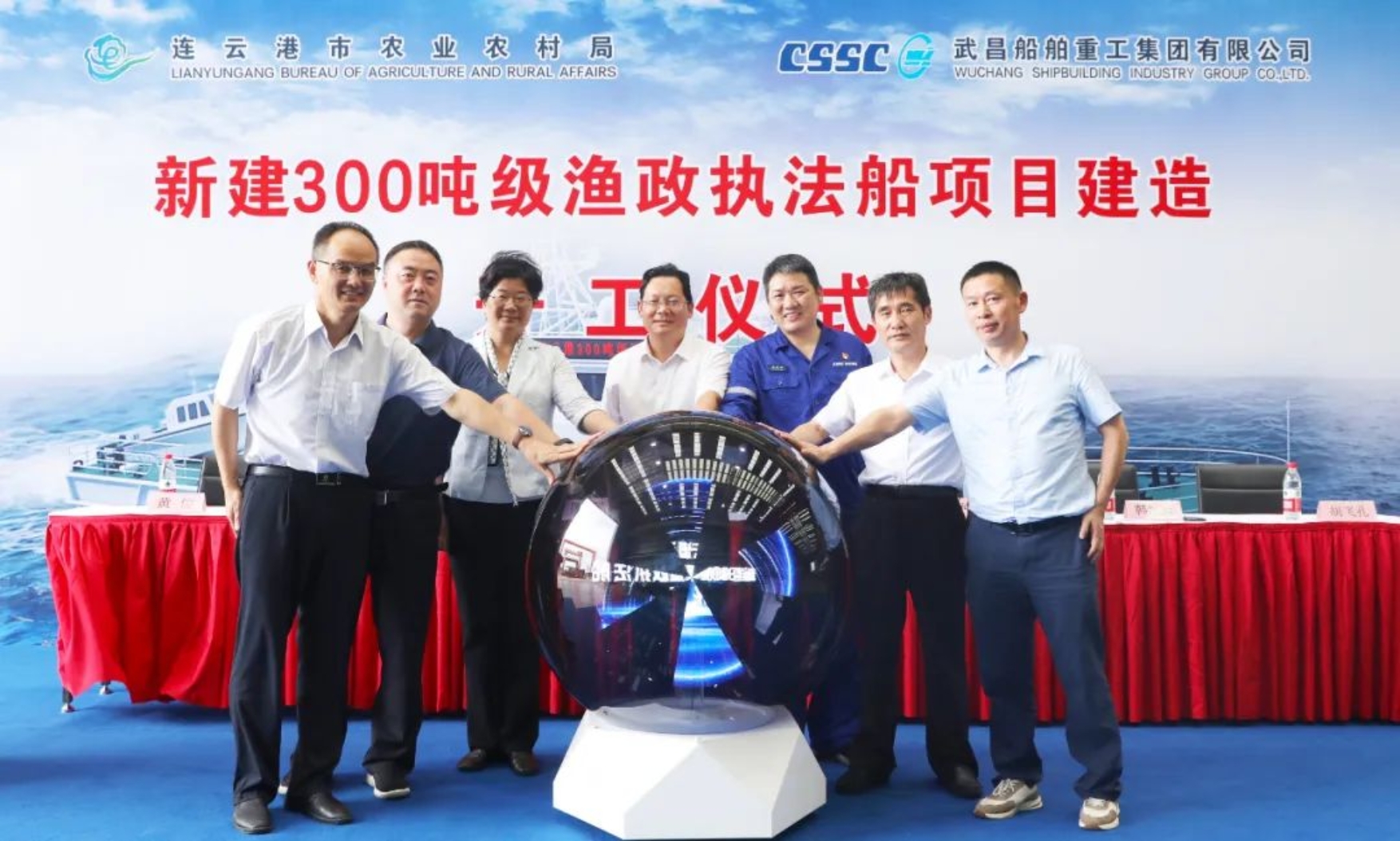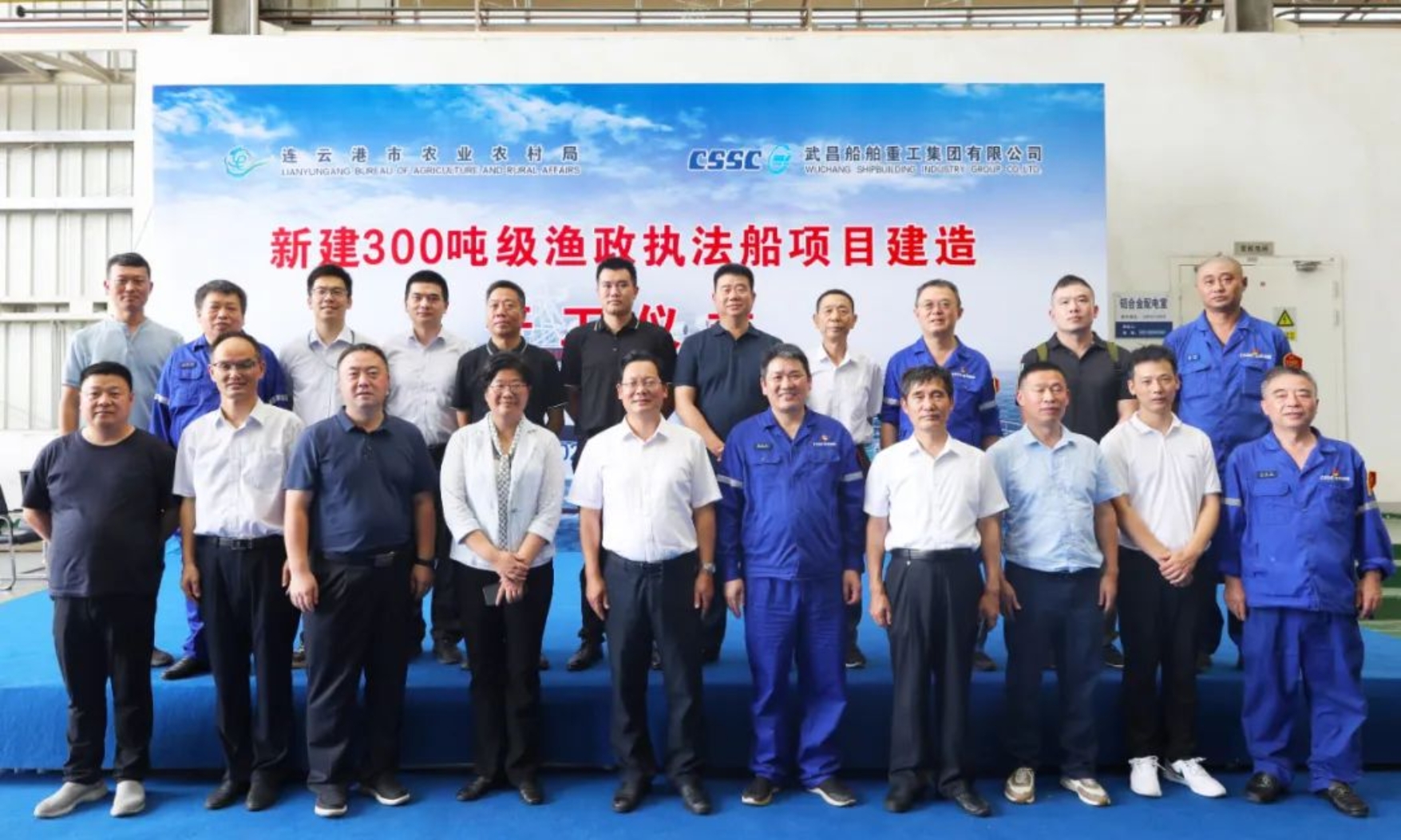 開工儀式在武昌造船雙柳廠區鋁合金車間舉行,連云港市政府副秘書長張永華、連云港市農業農村局局長陳鳳,連云港市財政局副局長韓加兵,連云港市海洋與漁業綜合行政執法支隊支隊長張長春,武漢船舶設計研究院有限公司執行董事黃俊,武昌造船黨委委員、總會計師陳仲明及各單位相關領導出席開工儀式。