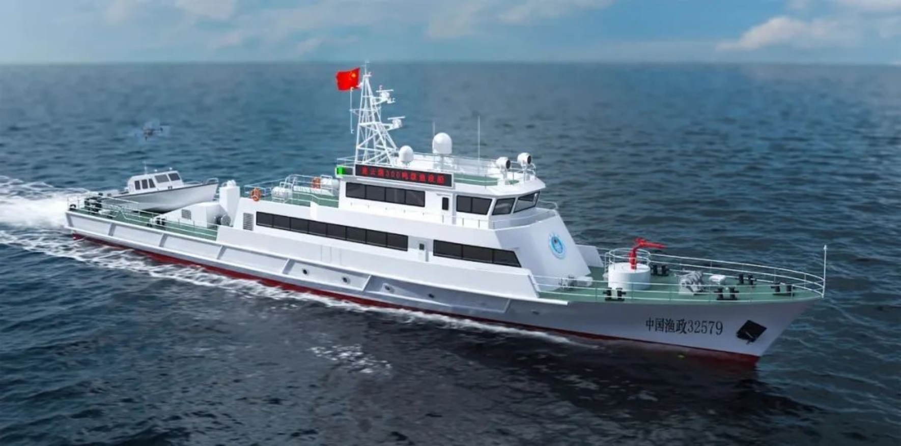 該船總長53米,型寬7.8米,型深4米,采用通長甲板、雙機、雙槳,直線推進方式;作為新一代300噸級漁政船,在繼承以往300噸級漁政船的優良耐波性基礎上,配備小艇艉滑道收放系統及12米級高速執法快艇,升級水炮執法系統、舷側排氣系統;還配備了全船艙內外視頻監控系統及手持紅外微光融合彩色夜視設備、全船信息化系統等,綜合性能進一步提升。