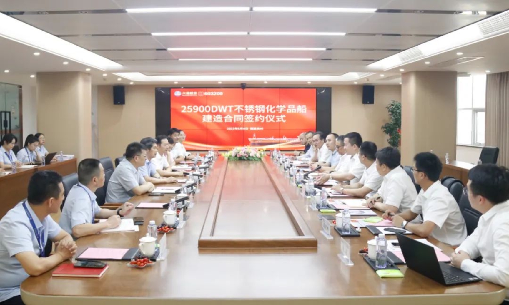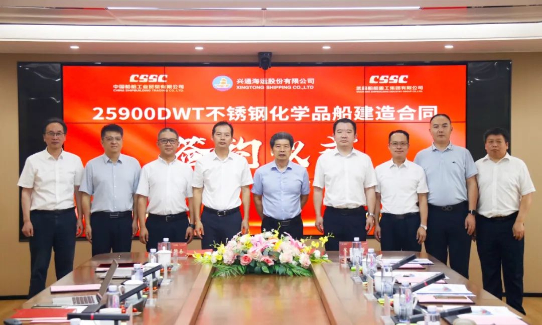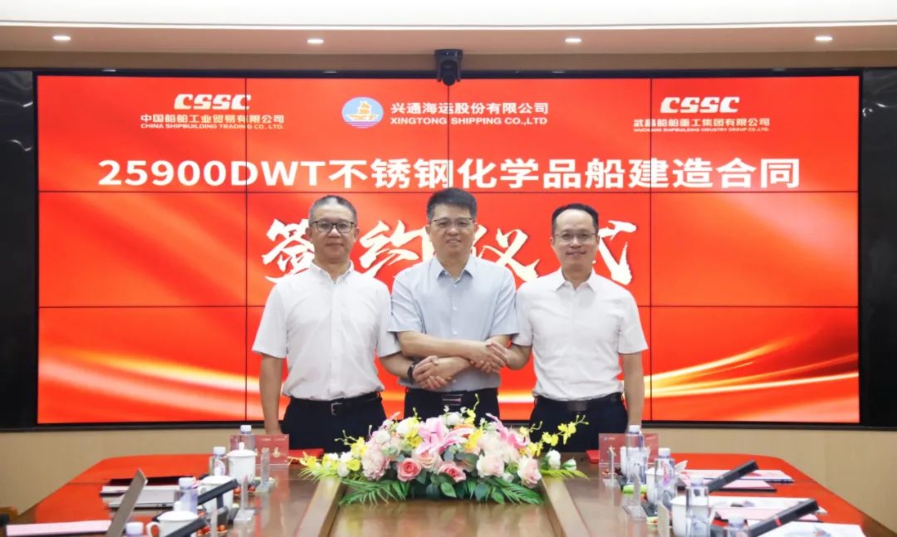8月8日,中國船舶集團武昌造船聯合中國船舶工業貿易有限公司與興通海運股份有限公司下屬興通海獅航運有限公司、興通海豹航運有限公司簽訂兩艘25900載重噸不銹鋼化學品船建造合同