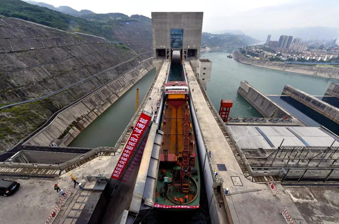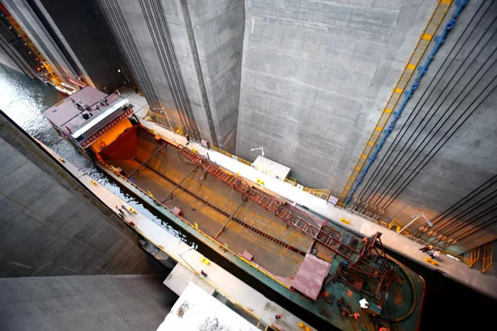向家壩 升船機(jī)金結(jié)設(shè)備的制造、安裝、調(diào)試開(kāi)始于2013年3月,歷時(shí)62個(gè)月,終于在今天成功對(duì)社會(huì)開(kāi)放,開(kāi)啟長(zhǎng)江至金沙江的大門。試通航期間計(jì)劃每日通過(guò)4~8條船。這標(biāo)志著長(zhǎng)江黃金水道向上游金沙江流域延伸了175公里,途徑四川、云南兩省的7個(gè)縣,將長(zhǎng)江黃金水道聯(lián)通至云貴川,開(kāi)啟造福云貴川之路,起到“一帶一路”造福地方的作用。