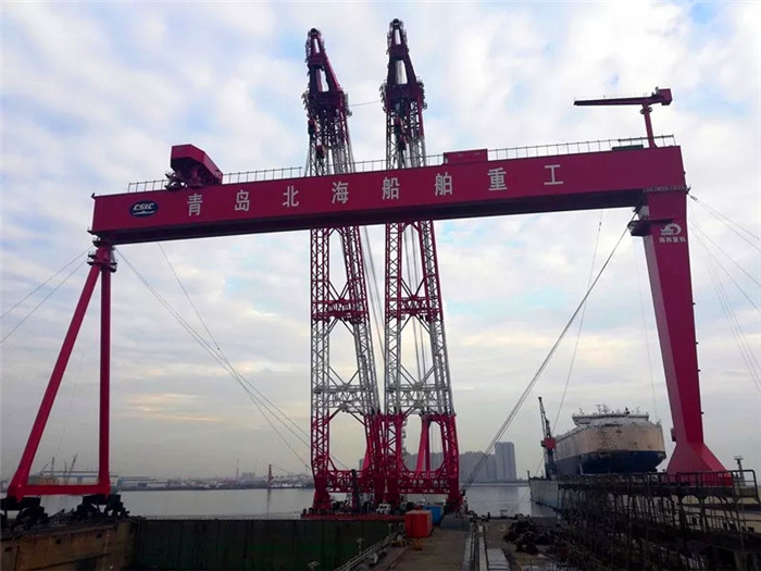 項目實施過程中,北船重工項目部在各級領導的支持和各部門人員的大力配合下,精心組織策劃,面對今年暴雨大風天氣頻繁和大型活動影響等諸多不利因素,通過不斷優化施工工藝,做好工序銜接,加班加點搶工期。在原南塢墻拆除中首次采用繩鋸切割拆除的新工藝,僅用12天時間完成了長70米、高13米、厚度達到7米的塢墻拆除和清理。500噸龍門吊三大件浮吊安裝受天氣、海況、超高空作業等因素影響大,大型構件封固和安裝中存在很大的風險,主梁與剛性腿和柔性腿的高空精確對位也是項目的重要難點,其中柔性鉸定位塊間隙只有2mm;項目部人員組織多次評審論證,反復討論安裝方案細節和安全保障措施,通過精心組織,500噸龍門起重機主梁順利一鉤到位,僅用一天時間就完成了2200噸主梁在76米高空的對位,安裝過程的安全和效率得到了保證。