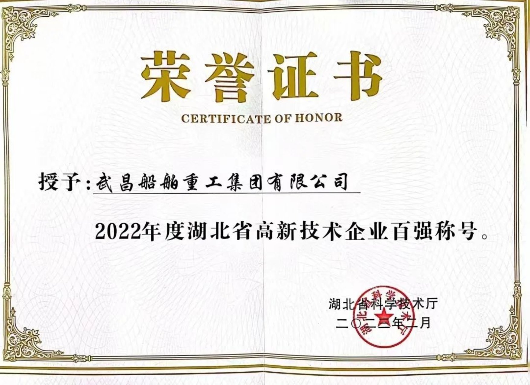 近日,湖北省科學技術廳發布了2022年度湖北省高新技術企業百強榜單,武昌造船榮獲湖北省高新技術企業百強稱號。
