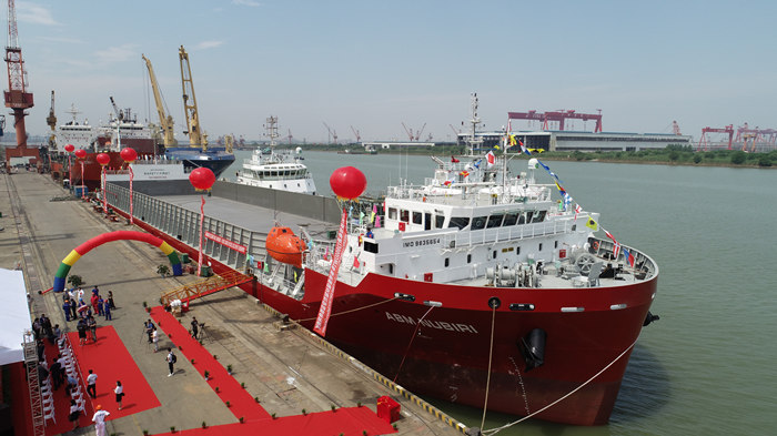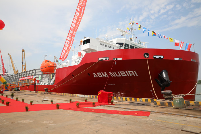 交付儀式現(xiàn)場,武船集團(tuán)副總經(jīng)理田軍、三泰集團(tuán)總裁金星闊、路易達(dá)孚集團(tuán)總經(jīng)理杜?艾瑪紐、PT ABM公司總經(jīng)理拉姆?馬修、三星物產(chǎn)公司副總裁李秉順先后致辭。三泰集團(tuán)總裁夫人金海鷗女士隨后為船只命名。