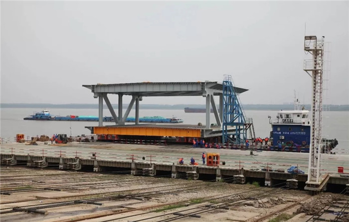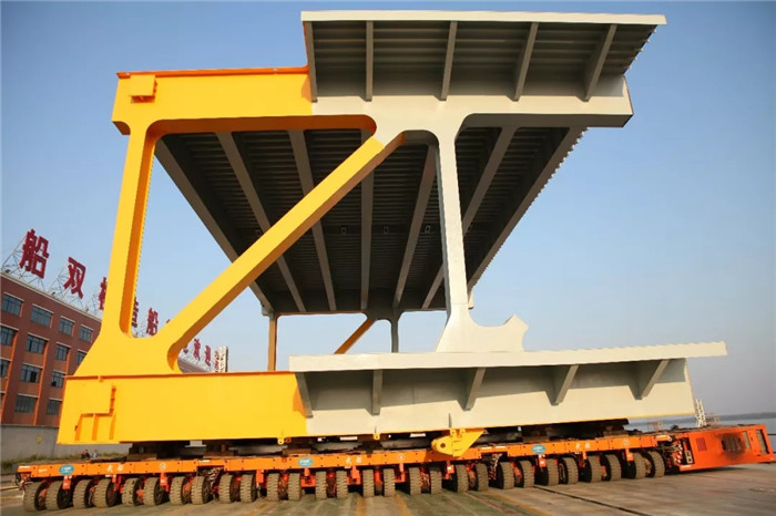 上午10時,首節鋼桁梁經過完整報檢,駐場監理確認后,由56軸線并聯的模塊車緩緩頂起,轉運到斜船架指定位置。