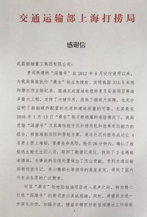 由武船集團為交通部上海打撈局建造的“深潛號”深潛水工作母船,自2012年8月交付以來,為船東執行多項重大工程,發揮關鍵作用,充分證明了該船硬件配置的先進性和建造質量的可靠性。尤其是在2018年1月13日“桑吉”輪搶險項目中,憑借著“深潛號”及其高性能升降補償吊機和優秀定位能力的組合,為事故的處置做出了杰出貢獻。憑借著該船優異的實際表現,船東特發來感謝信對武船集團表示肯定。