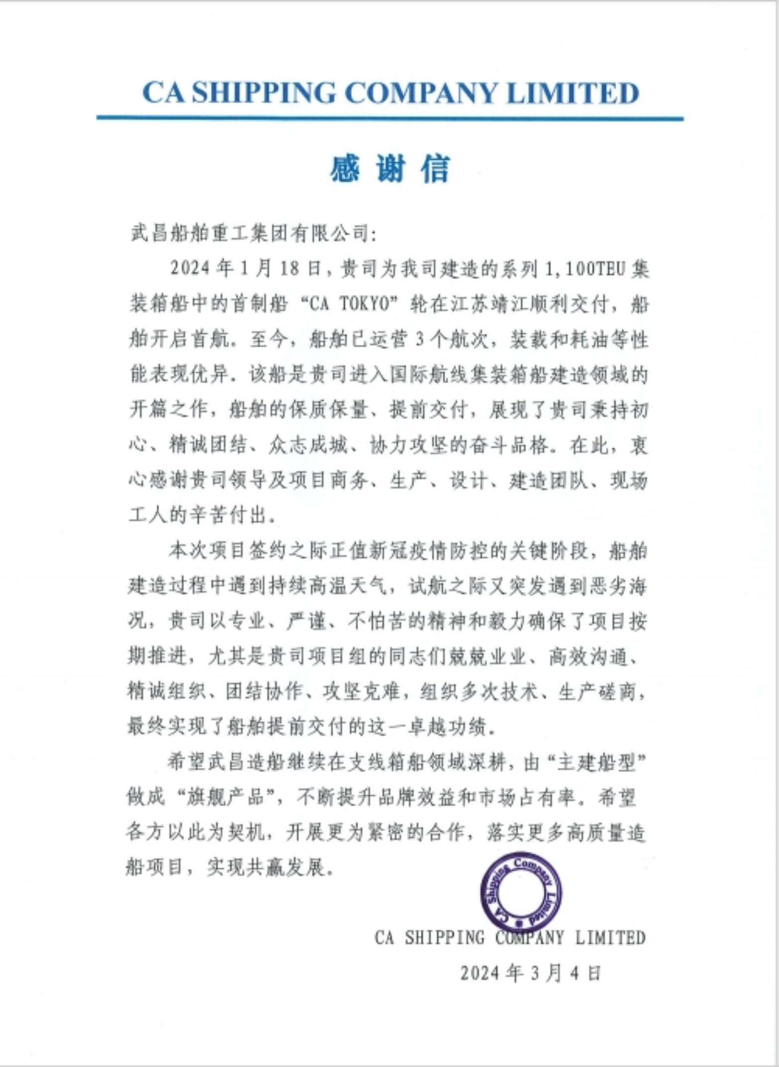 “1月18日,貴司為我司建造的系列1100TEU集裝箱船中的首制船“CA TOKYO”輪在江蘇靖江順利交付,船舶開啟首航。至今,船舶已運營3個航次,裝載和耗油等性能表現優異。”——CA SHIPPING COMPANY LIMITED
