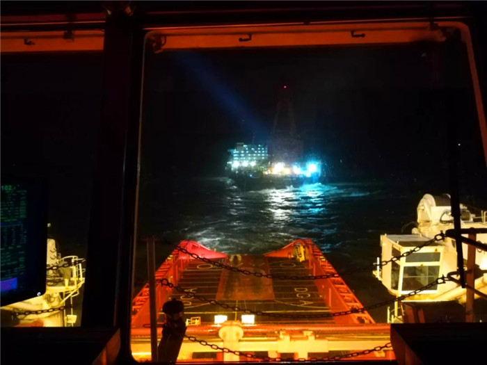 9月17日零時,“華虎”輪完成接拖全部準備工作,而后撇纜、連接小絞車鋼絲,緊接著“海洋石油202”輪錨纜上甲板、連接錨纜和拖帶鋼纜、錨纜外放110米....引纜傳遞成功、絞車鋼絲傳遞成功、拖纜連接成功、纜車長度調整到位,各項工作就緒,“華虎”輪開始向外移動!由于“海洋石油202”輪是右船艏觸礁,在當時的情況下只能橫向或者往左后牽引,近乎于橫風拖帶!橫風拖帶不僅難度非常大,只要一不留神操作不當或船舶性能失衡,“華虎”輪隨時會面臨失位風險!風小時,抓緊時機側面受風往外拉,風大時,立即調整自身船態。“華虎”輪就這樣在波濤洶涌的海浪中與“山竹”周旋著,經過3個小時的鏖戰,“海洋石油202”輪成功脫淺!單根鋼纜拖帶,穿越一方航道,避開航道燈標和幾條拋錨船,又經過2個多小時,“海洋石油202”輪在“華虎”輪的牽引下安全抵達錨地拋錨!
