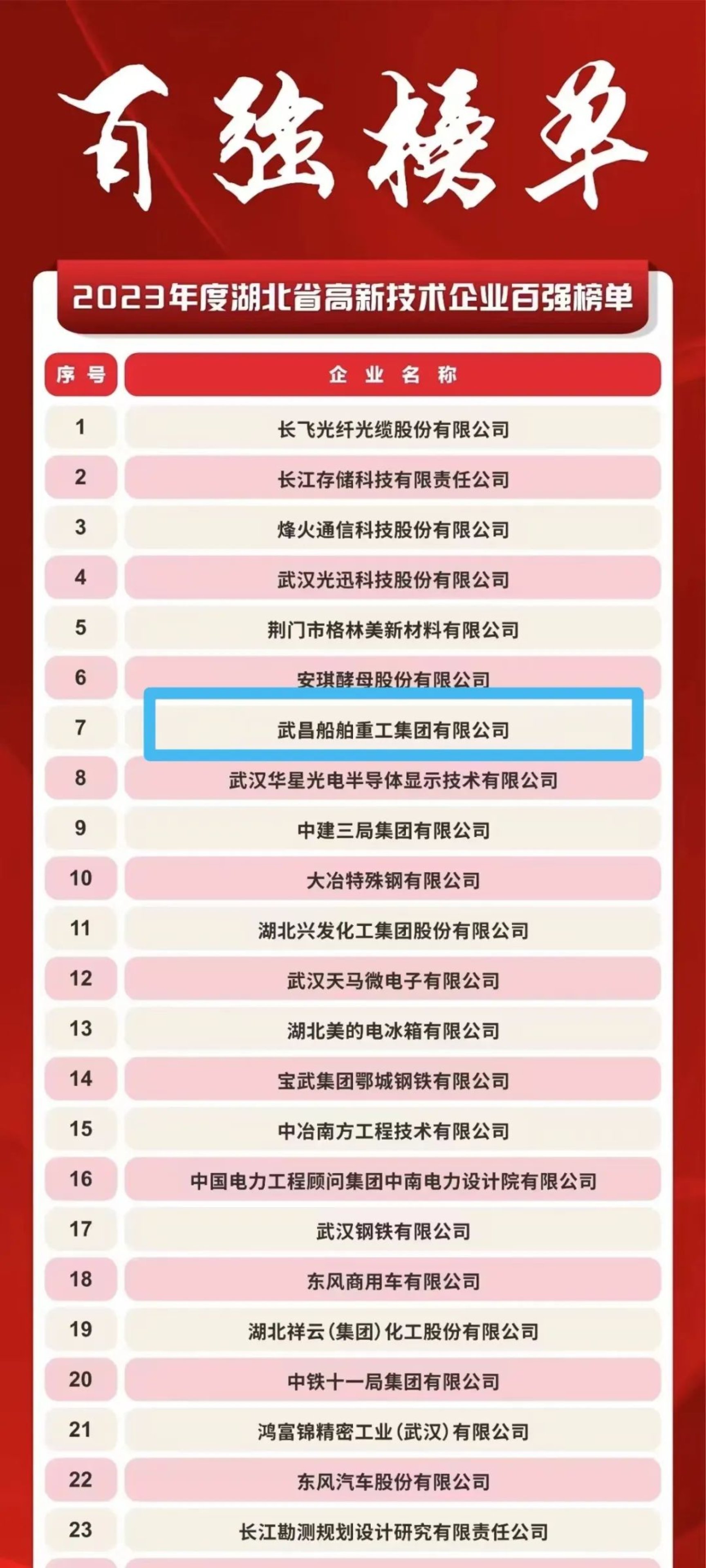 3月7日,湖北省科技廳組織召開了2024年湖北省高新技術企業春曉行動啟動會,會上發布了湖北省2023年度高新技術企業百強名單,中國船舶集團武昌造船繼2022年度后再次上榜,且排名從2022年度的第62名上升至第7名。
